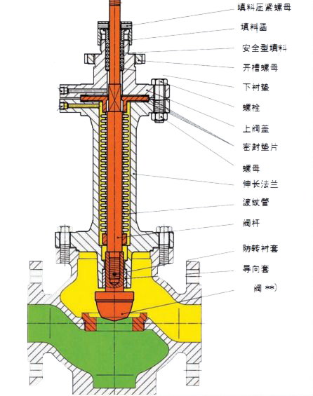 氣動波紋管密封調(diào)節(jié)閥就是在密封元件外面加了一層保護(hù)膜,防止帶腐蝕性的介質(zhì)直接接觸密封元件,而且在介質(zhì)壓力增大時,波紋管隨之伸長,降低介質(zhì)對密封面造成沖擊,在腐蝕性很強的介質(zhì)工況下,還可以采用雙波紋管結(jié)構(gòu)密封。